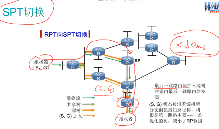 在收到组播源发送的组播流后,如果在 r p 上面有对应的组播组的存在,会转发组播流量,同时向组播源发送一个(s,g) 的join,由 r p 到组播源去建立一个最短路径树;2.叶路由器由rpt切换为spt(之前的rpt路径非最优,会增加转发延时(实时业务对转发延时要求在50ms内),为保证组播转发的最短路径,就需要在叶路由器上开启spt的切换功能),当组播流量超过阈值,叶路由器就会向组播源发送(s,g)的join,构建从源到叶路由器的最短路径树。