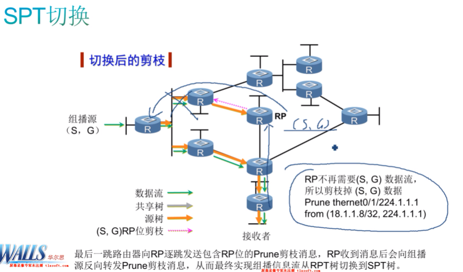 切换后的问题,叶路由器需要建立到达组播源的spt,之前的到达rp的rpt还存在。那这样就意味着,同一份组播流量既来自于从源到达叶路由器的spt,也来自rp到达叶路由器的rpt,这样流量会出现两份,不行的。So 一旦叶路由器切换到spt后,就需要把rp上rpt剪枝掉,就需要向rp发送S,g的prune,*,g是继续要保持的(//因为rp已经知道组播源了,这里应该只是删除(s,g)的outgoing if)。一般情况下,在prune或join报文里只会单独包含一种,只有在一种特殊的情况,就是spt切换后,叶路由器在向rp发送prune报文的时候,会在一个报文里同时标识prune和join-在pim里称为原子报文(指同时包含prune和join)。因为这个报文都是发送给rp的,但是prune和join是发送给不同表项的,prune是用于S,g的,join是用于*,g的。保留*,g的原因:一旦叶路由器到达组播源的spt故障,就无法接收到组播流量,那就留一条后路,从rp接收。如果把*,g 也prune掉,rp就会认为表项里没有任何接收者了,就不需要再接收组播源发送的组播流了,然后rp就会继续把到达组播源的S,g prune掉,备路就没了。此时再想回切,转发路径的重新建立需要时间(重新建立rpt和spt),spt回到rpt切换会很长。so需要告诉rp,你不需要给我转发s,g的流量,但是*,g的表项要保留。