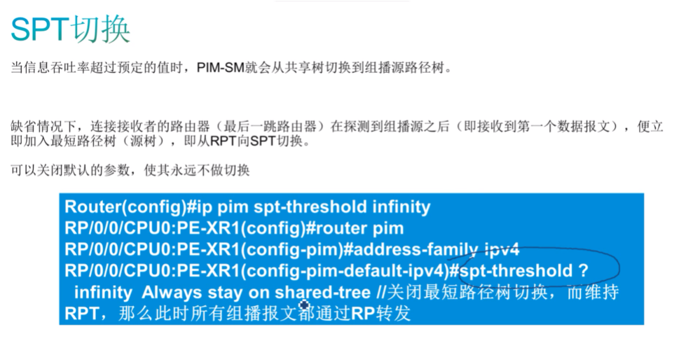 在叶路由器上配置一个切换的阈值,如果流量的大小超过了这个阈值,就切换到spt。如果小于这个阈值,则切换回rpt。