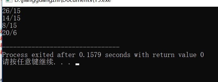 #include<iostream> using namespace std; int main(){ fraction f1(3,4),f2(5,2); fraction f3(1,1); //试了用 fraction f3; 显示错误,why f3=f1+f2;f3.show(); f3=f1-f2;f3.show(); f3=f1*f2;f3.show(); f3=f1/f2;f3.show(); return 0; }