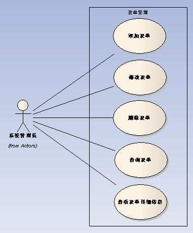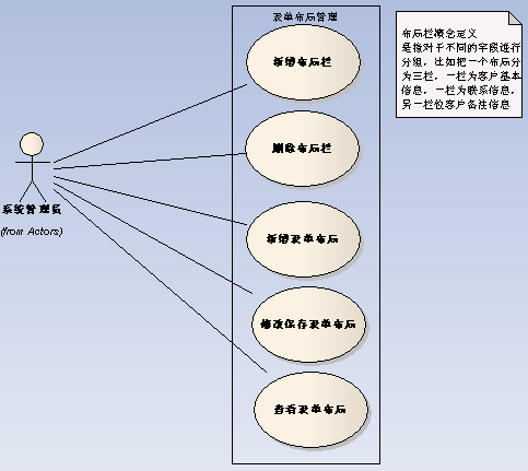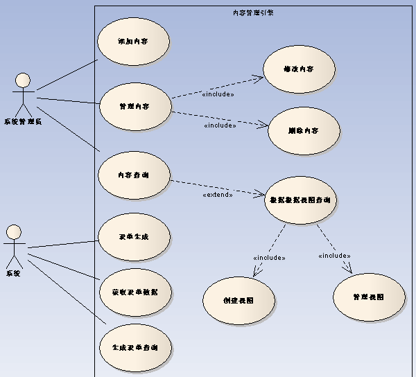 这个用例图包含两个参与者(角色),但是设计的时候放到一块了,只是简单的标示了一下用例,而用例与用例之间的关系没有标示,不过大家应该能够明白他们之间的关系(管理员参与者用例与系统参与者用例的关系)。