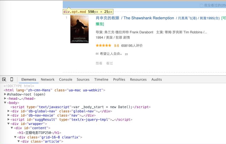 OK,可以看出,这个页面其实有一个列表,其中放着25条电源信息。我们选中某一条电影,右键选择检查即可查看选中条目的HTML结构。如下图所示: