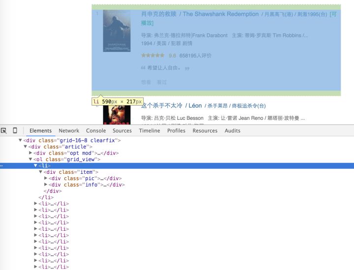 - 电影列表在页面上的位置为一个class属性为grid_view的ol标签中。