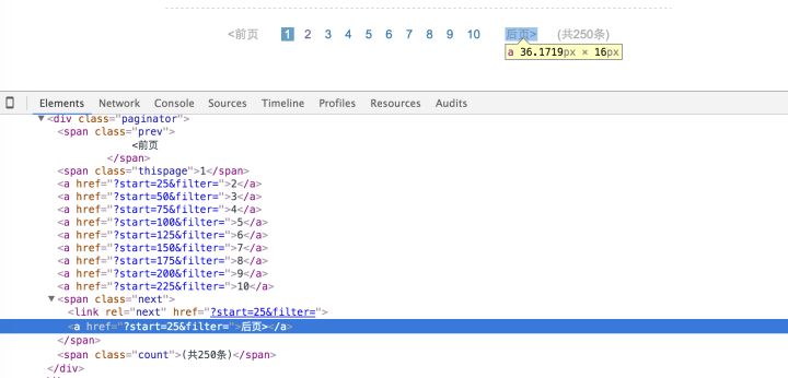 到这一步,我们已经得到了电影名称(由于只是演示BeautifulSoup的用法,这里不详细取出每条电影的所有信息),刚才提到一共有10页数据,怎么处理翻页的问题呢?一般在我们确定内容的前提下,可以直接在代码中写死如何跳转页面,但是为了让我们的爬虫更像爬虫,我们让它找到页码导航中的下一页的链接。