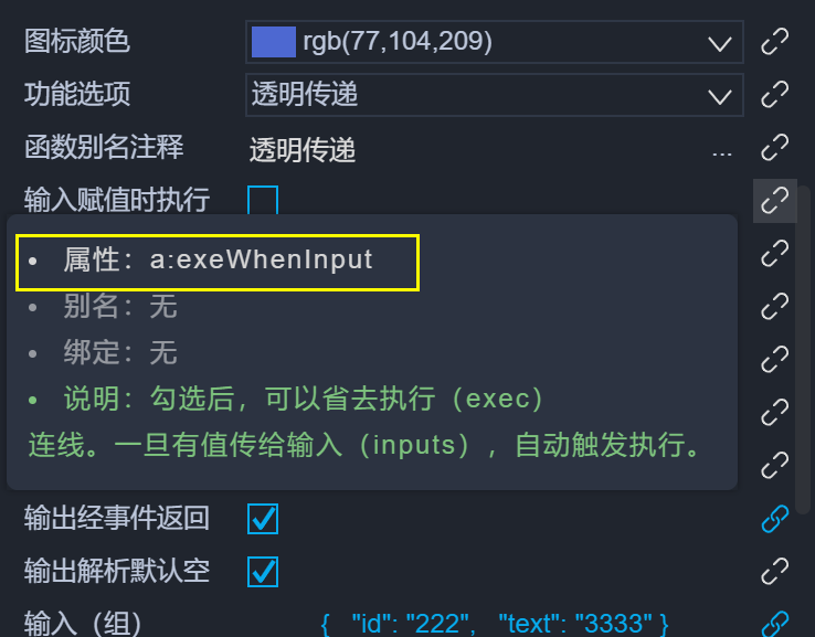 连线属性组通常不需要自己设置,仅仅用来记录当前组件连出操作其他组件的连线配置。当然,如果涉及到对连线做解析、常数复制等,需要用到属性组中的个别属性。
