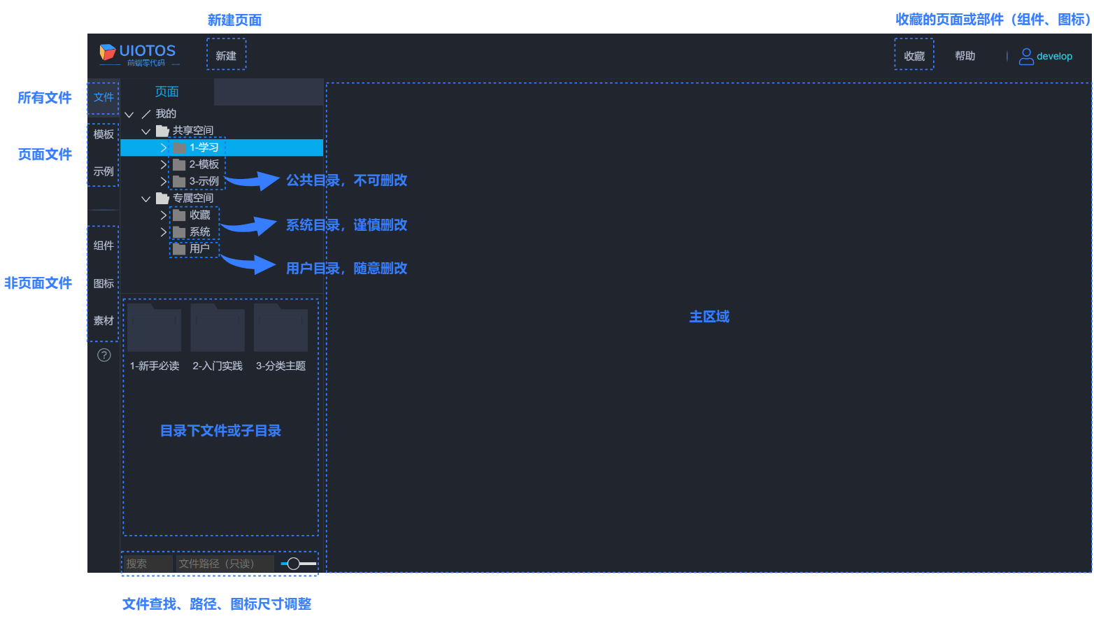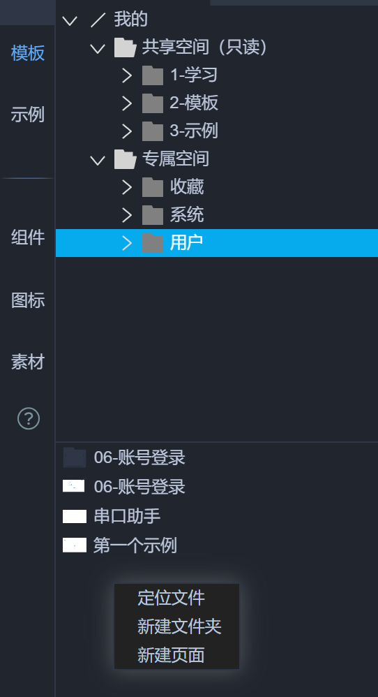 左侧工具条上半部分的文件、模板、示例,主要是是页面。其中模板和示例在文件的页面中,分别对应目录我的-共享目录-2-模板和3-示例。