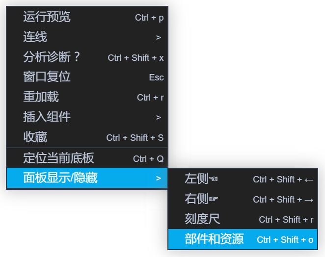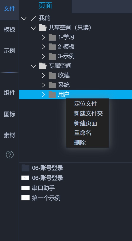 其中文件默认是所有页面的文件目录结构,实际上还可以是部件(组件、图标)、资源(素材)等。在编辑页面中空白区域右键,可以打开显示: