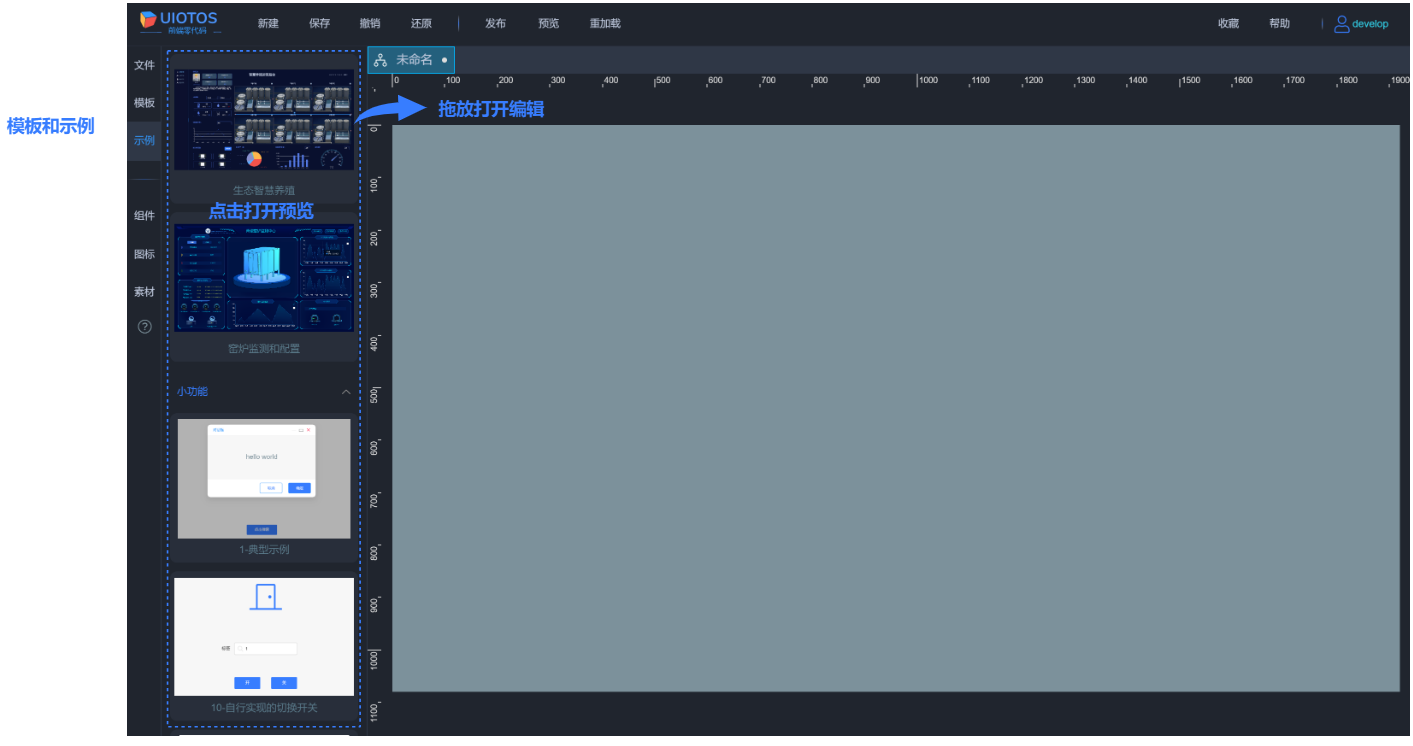 在有页面打开的情况下,点击侧边栏的示例或模板,将以预览图列表形式展开,点击时将打开运行预览;拖放一下可以打开编辑。