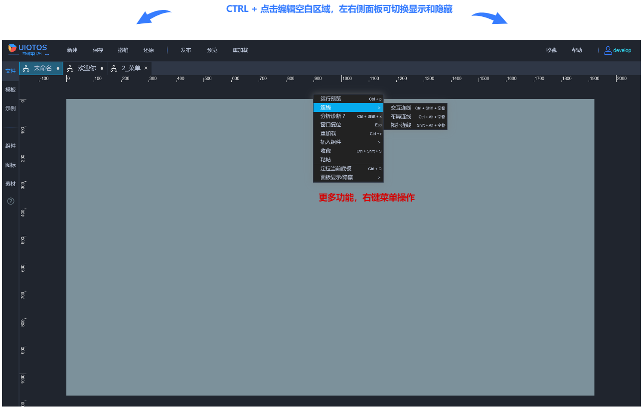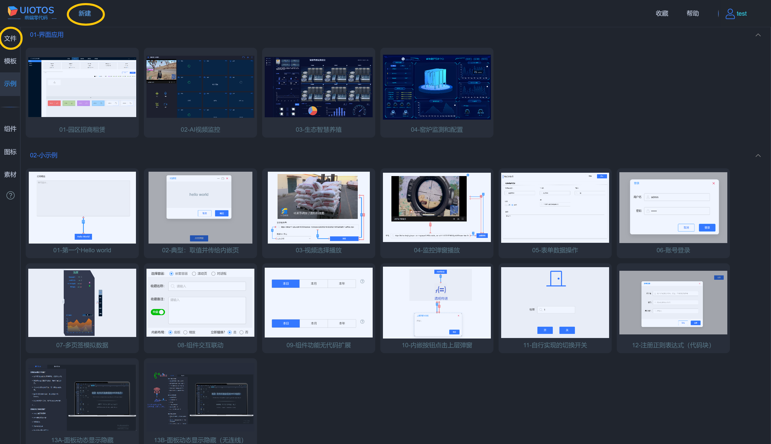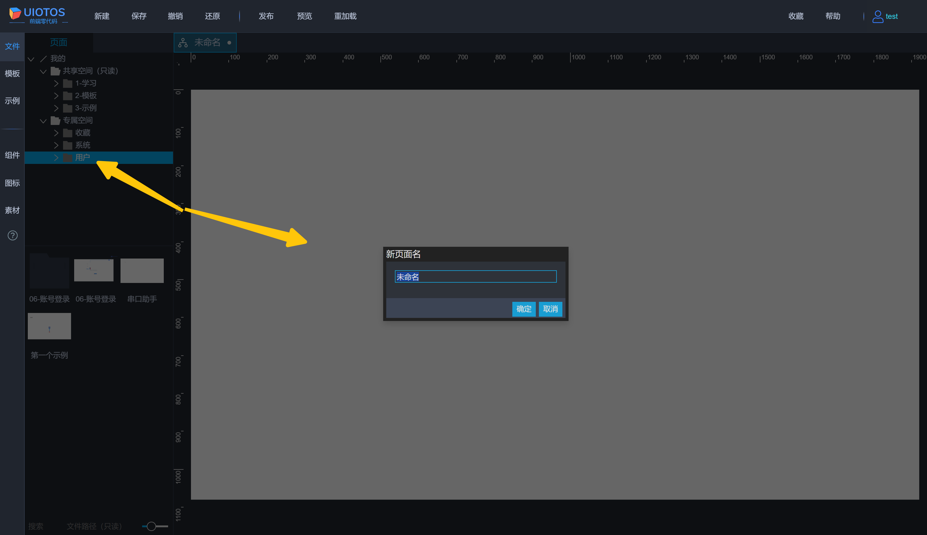 登录时,如果上次有未关闭的页面,会自动打开;如果没有,那么默认打开示例。如下所示,可以直接在左上角新建,或者点击文件,随后在切换的显示中,点击屏幕中间的图标点击新建页面。