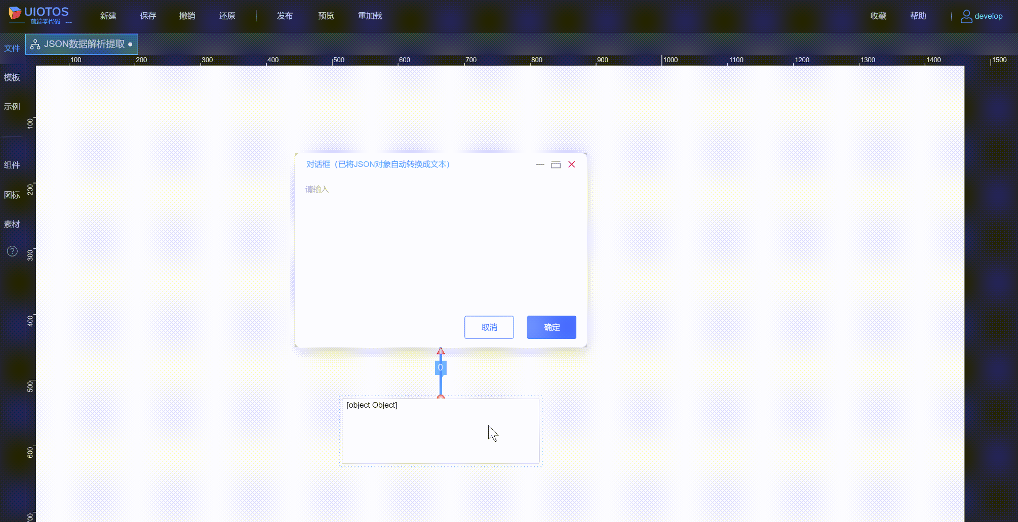 - UIOTOS编辑的嵌套、连线配置,也能以JSON形式输出,给其他框架使用,双向配合。