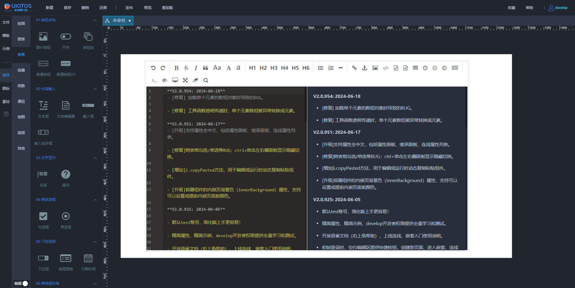 完成页面新建后,就可以点击左侧组件,属性面板中,拖放想要的组件到页面,在工具栏中点击保存、预览,即可查看效果、开启您的开发之旅!