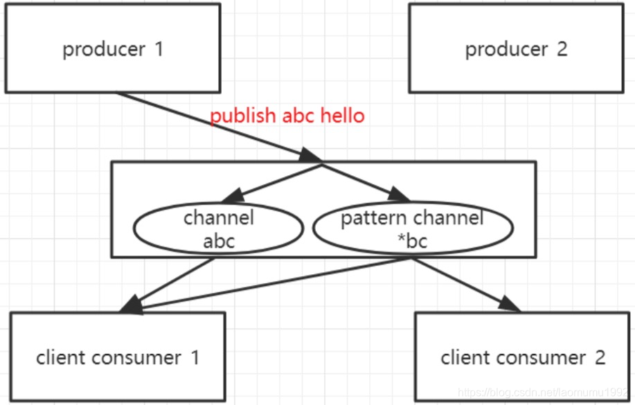 channel分两类,一个是普通channel、另一个是pattern channel(规则匹配), producer1发布了一条消息 【publish abc hello】,redis server发给abc这个普通channel上的所有订阅者,同时abc也匹配上了pattern channel的名字,所以这条消息也会同时发送给pattern channel *bc上的所有订阅者。