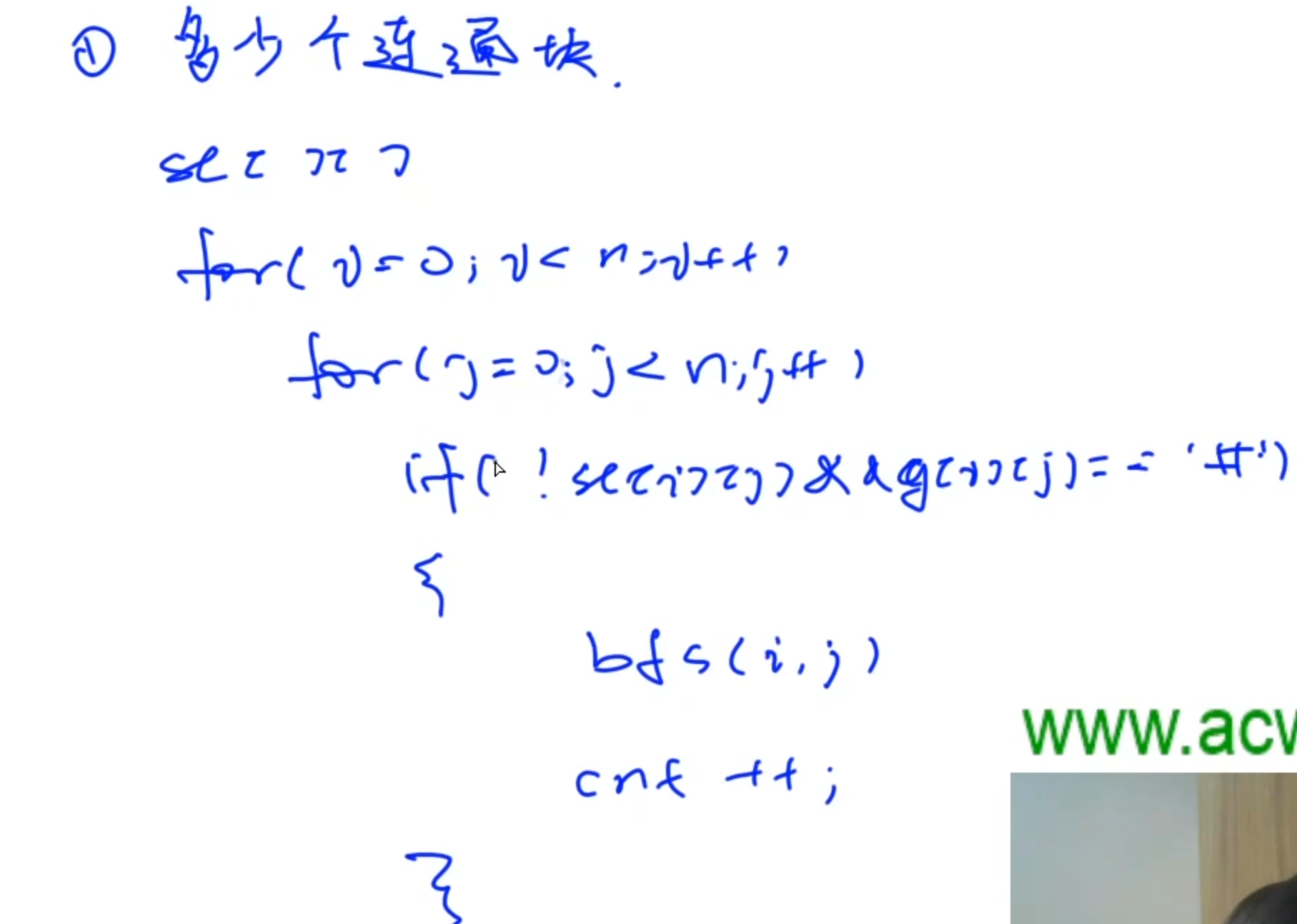 首先要考虑有多少个连通块,可以直接枚举每个点,对每个点进行一次搜索,与这个点连通的点共同构成一个连通块,数量用cnt表示,在搜索中,检查判断是否会被完全淹没(Flood Fill)