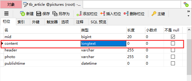 这时我们必须在数据库中更改content字段的类型为longtext