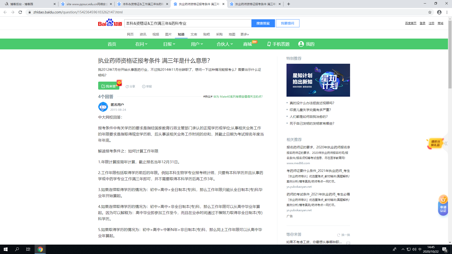 小丽是药学专业的一名本科生,现已从事药学专业的工作,目前她想考取一个资格证,但是报名条件中要求其工作满三年。那么,小丽想考取的是什么证。(请回答并附截图证明。)