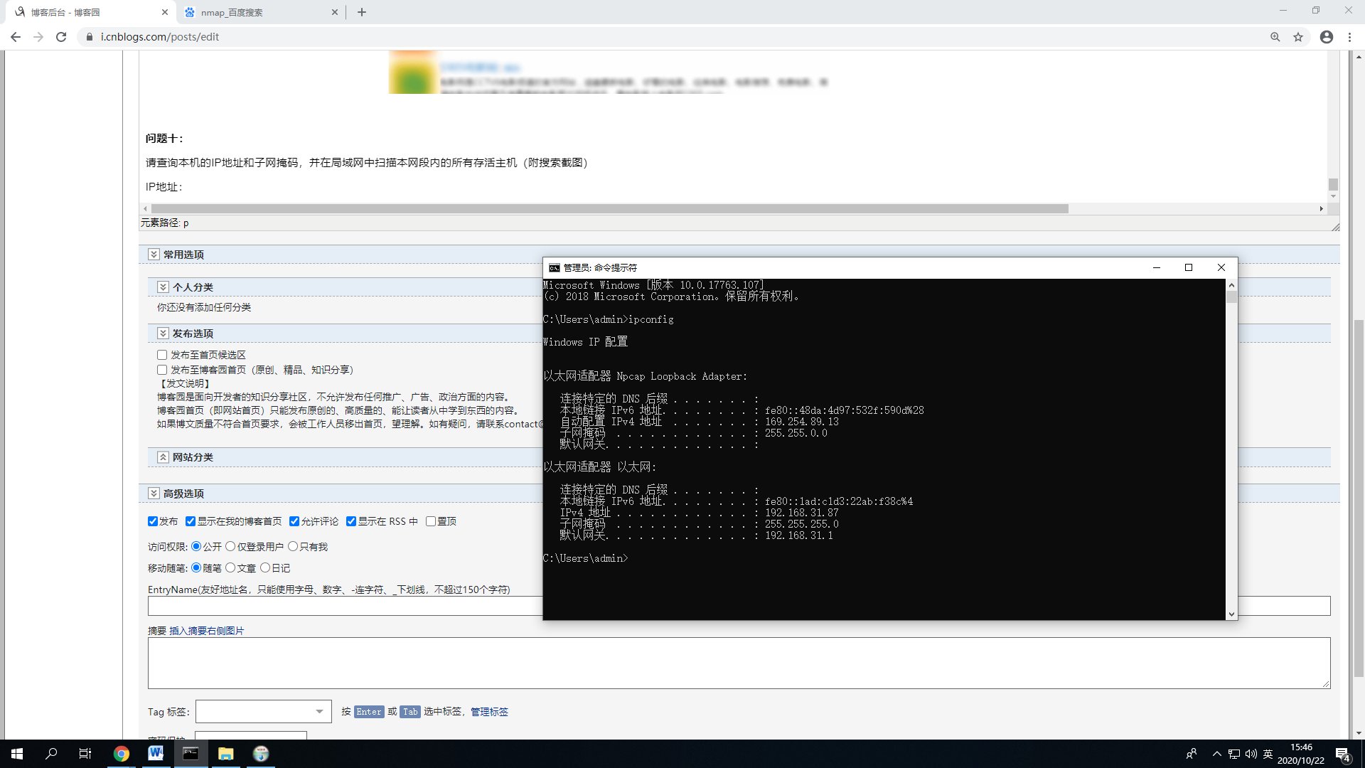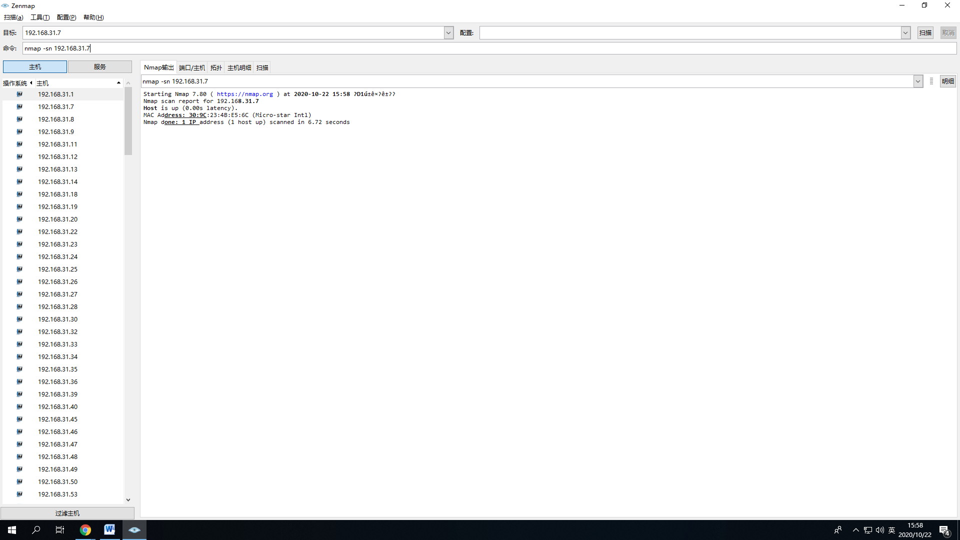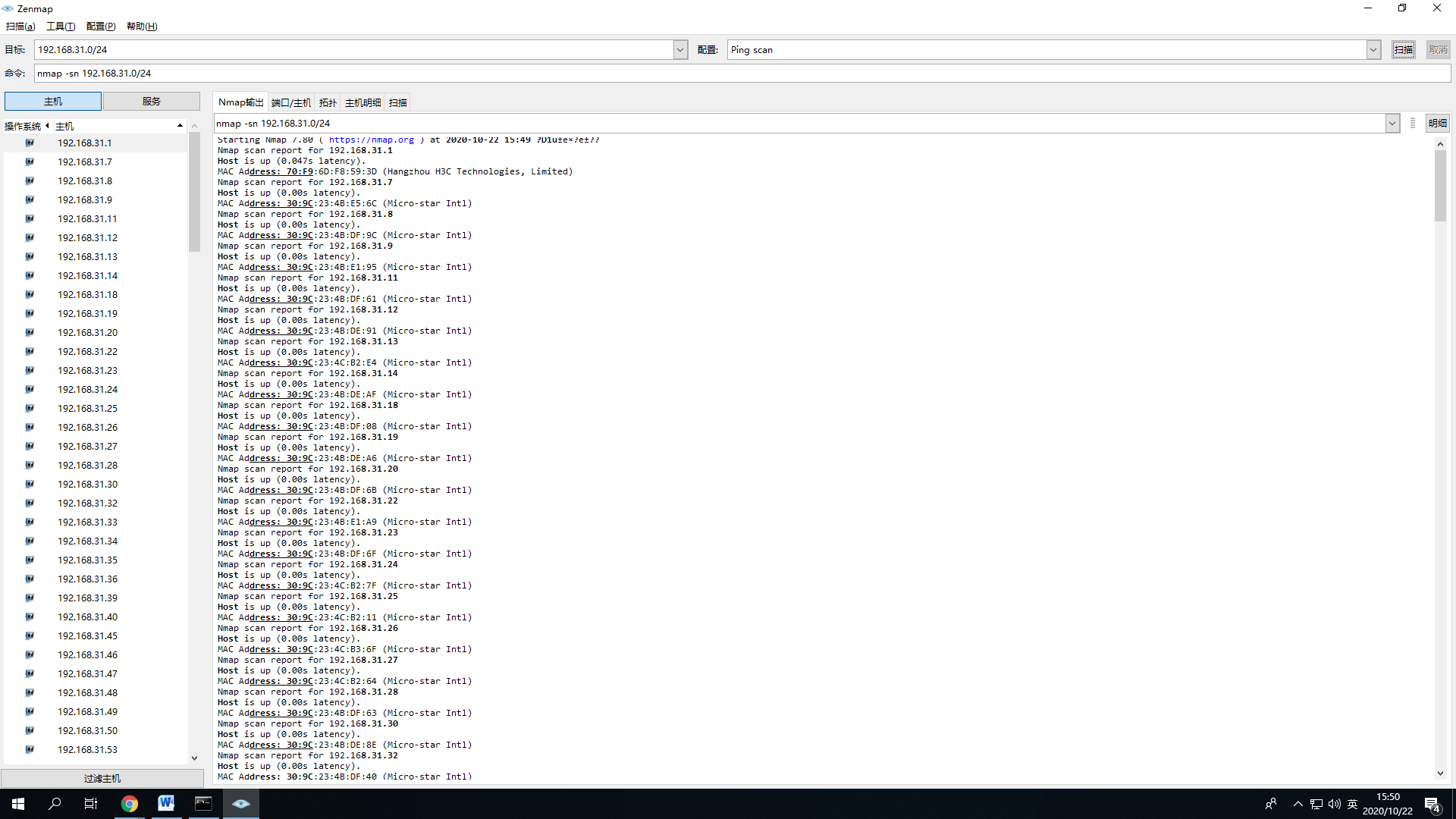 请查询本机的IP地址和子网掩码,并在局域网中扫描本网段内的所有存活主机(附搜索截图)