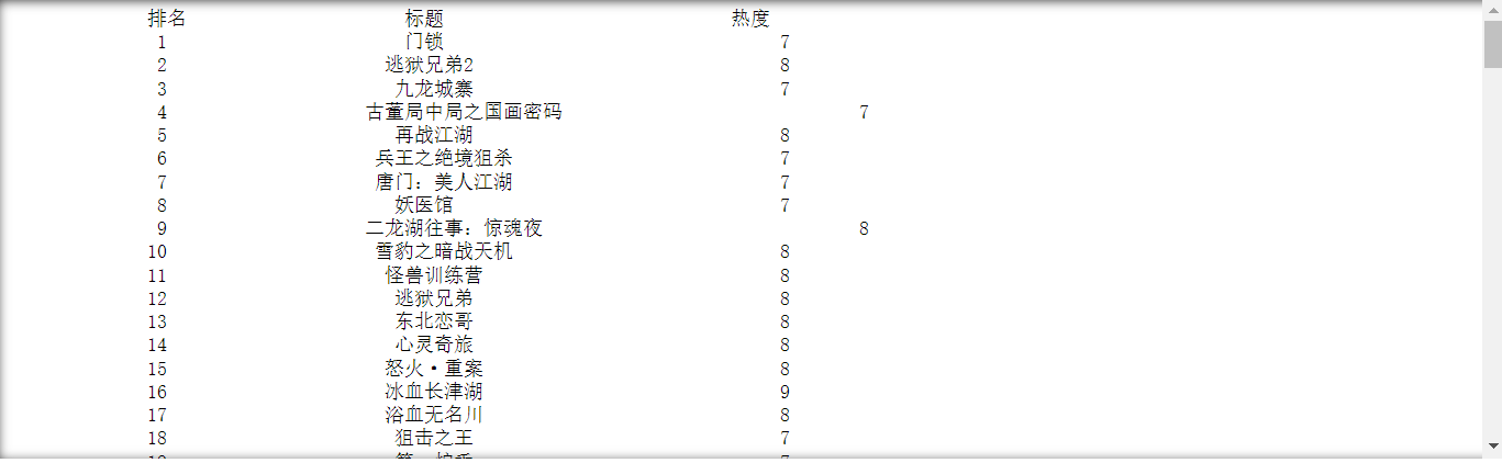 通过爬取该网站热播电影的电影名称,热度数据及排行,然后将三者通过绘图技术表现出来,以分析出人们对于电影的种类娱乐化的规律。