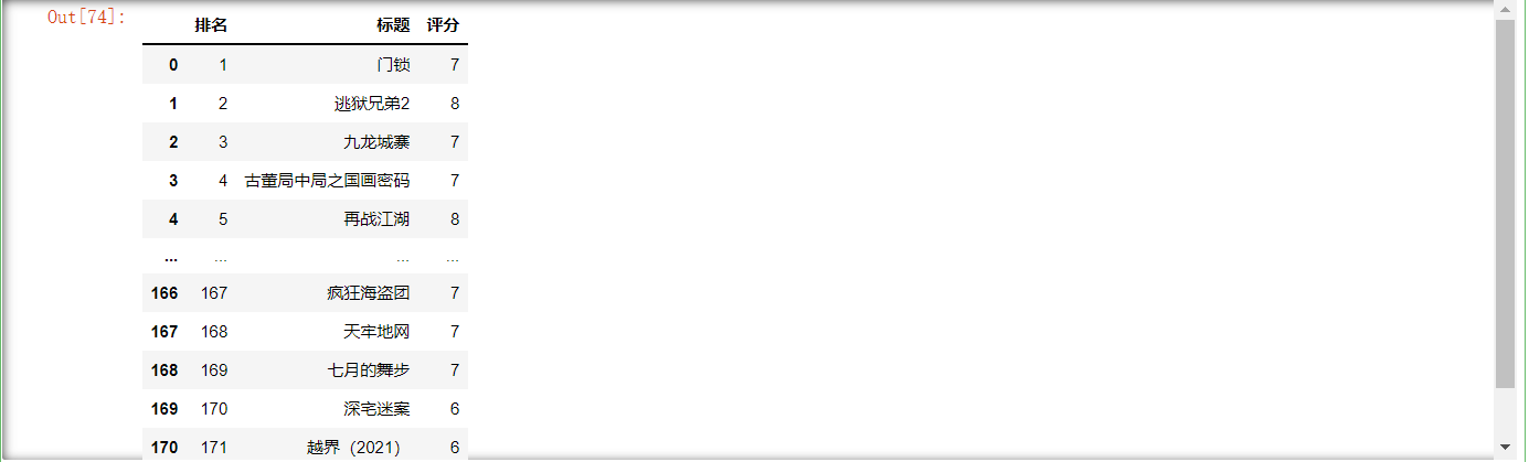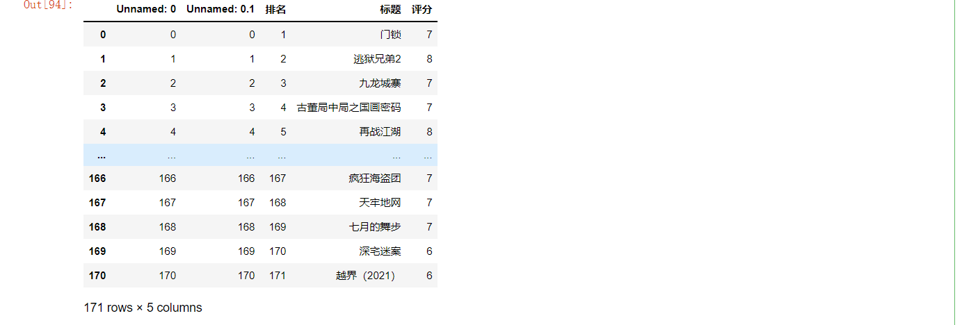 1 print('{:^5}\t{:^40}\t{:^10}'.format('排名', '标题', '热度')) 2 num = 171 3 lst = [] 4 for i in range(num): 5 print('{:^5}\t{:^40}\t{:^20}'.format(i+1, ulist[i], point[i])) 6 lst.append([i+1,ulist[i],point[i]]) 7 df = pd.DataFrame(lst,columns=['排名','标题','评分'])
