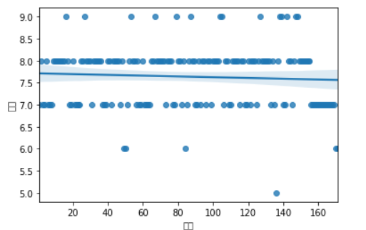 1 import seaborn as sns 2 sns.regplot(df.排名,df.评分)