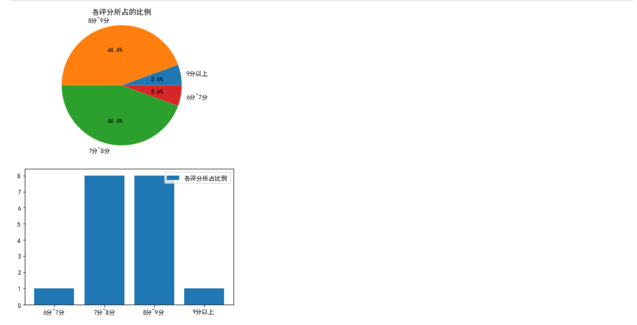 1 import matplotlib.pyplot as plt 2 plt.rcParams['font.sans-serif']=['SimHei'] #显示中文 3 plt.rcParams['axes.unicode_minus']=False #显示负数 4 Type = ['9分以上', '8分~9分', '7分~8分', '6分~7分'] 5 Data = [1, 8, 8, 1] 6 plt.pie(Data ,labels=Type, autopct='%1.1f%%') 7 plt.axis('equal') 8 plt.title('各评分所占的比例') 9 plt.show() 10 plt.bar(['6分~7分','7分~8分','8分~9分','9分以上'], 11 [1, 8, 8, 1], 12 label="各评分所占比例") 13 plt.legend() 14 plt.show()
