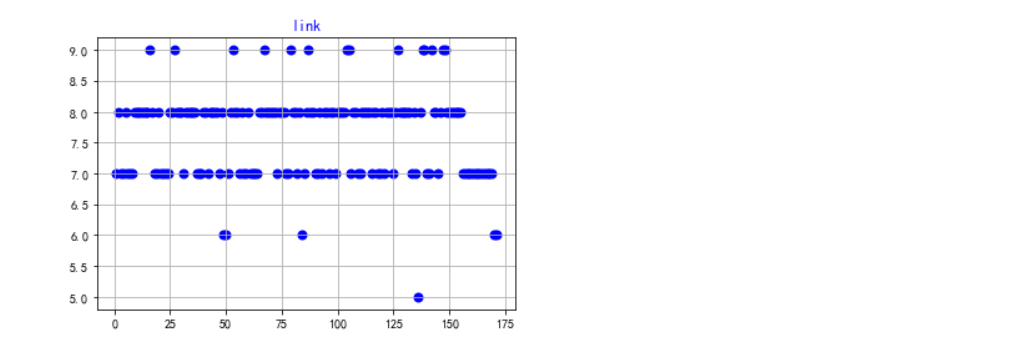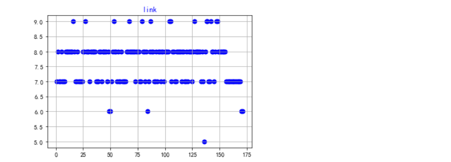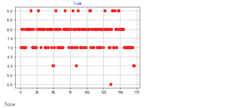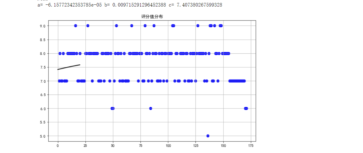 1 #选择排名和热度两个特征变量,绘制分布图,用最小二乘法分析两个变量间的二次拟合方程和拟合曲线 2 3 #正常显示中文 4 plt.rcParams['font.sans-serif']=['SimHei'] 5 #显示负数 6 plt.rcParams['axes.unicode_minus']=False 7 colnames=[" ","排名","标题","评分"] 8 9 X = df.排名 10 Y = df.评分 11 Z = df.排名 12 def A(): 13 plt.scatter(X,Y,color="r",linewidth=2) 14 plt.title("link",color="blue") 15 plt.grid() 16 plt.show() 17 def B(): 18 plt.scatter(X,Y,color="b",linewidth=2) 19 plt.title("link",color="blue") 20 plt.grid() 21 plt.show() 22 def func(p,x): 23 a,b,c=p 24 return a*x*x+b*x+c 25 def error(p,x,y): 26 return func(p,x)-y 27 def main(): 28 plt.figure(figsize=(10,6)) 29 p0=[0,0,0] 30 Para = leastsq(error,p0,args=(X,Y)) 31 a,b,c=Para[0] 32 print("a=",a,"b=",b,"c=",c) 33 plt.scatter(X,Y,color="blue",linewidth=2) 34 x=np.linspace(0,20,20) 35 y=a*x*x+b*x+c 36 plt.plot(x,y,color="black",linewidth=2,) 37 plt.title("评分值分布") 38 plt.grid() 39 plt.show() 40 print(A()) 41 print(B()) 42 print(main())