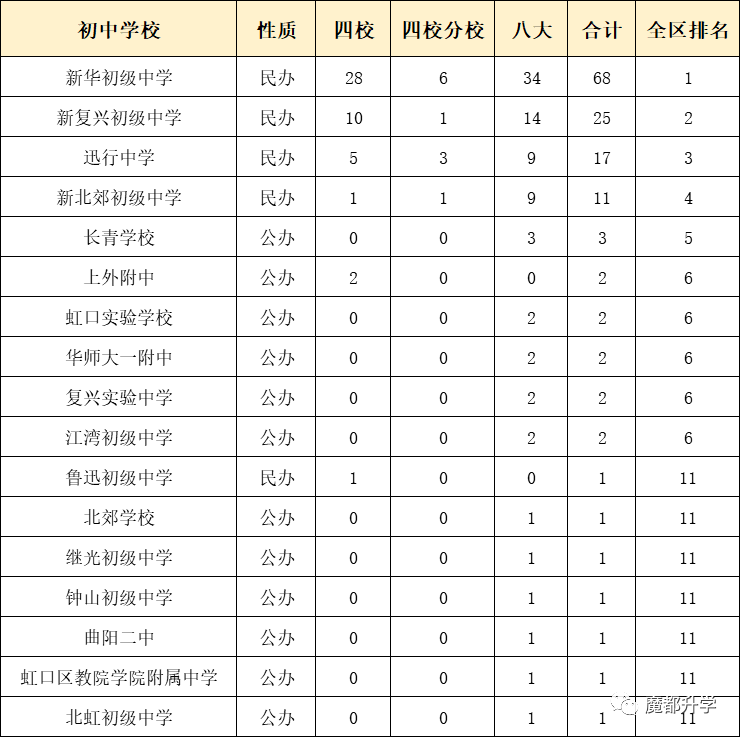 虹口区排名靠前的几所初中都是民办:新华初级中学、新复兴初级中学、迅行中学、新北郊初级中学,2019年四校八大预录人数依次为68、25、17和11人。