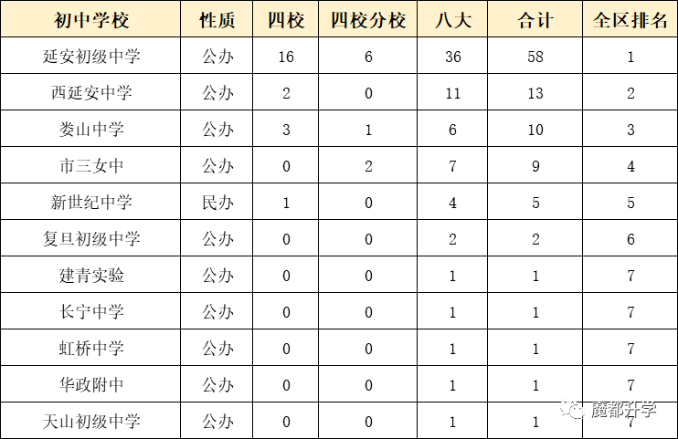 延安初级中学在区内是独一档的存在:四校预录16人,四校八大预录合计高达58人。