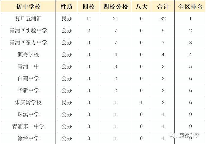 青浦区共11所初中有学生预录取四校八大,其中前3名分别为:复旦五浦汇、青浦实验、东方中学。