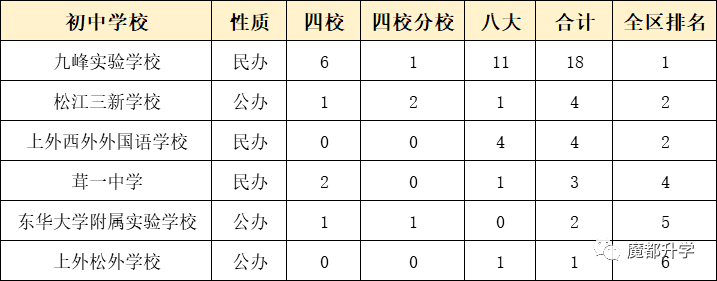 松江区共6所初中有学生预录取四校八大,分别为九峰实验、松江三新、上外西外外国语、茸一中学、东华大学附属实验学校、上外松外学校。