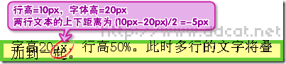1 p { font-size : 20px; line-height :10px; } 2 <p>字高20px,行高10px。此时多行的文字将叠加到一起。</p>