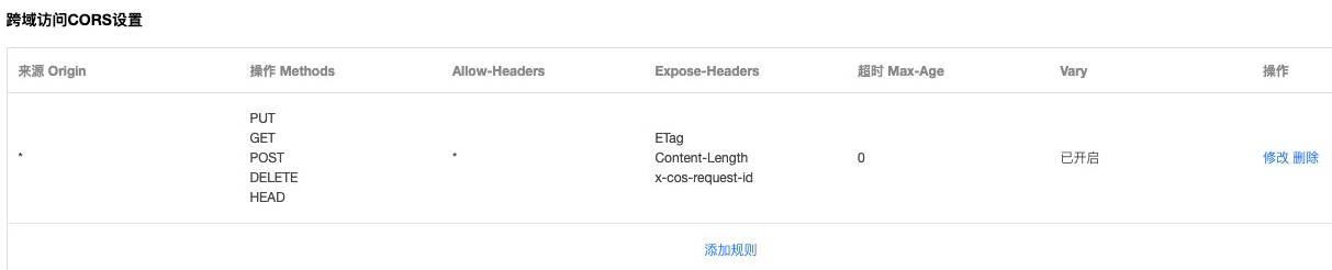 - 单击安全管理 > 跨域访问 CORS 设置,添加一行跨域设置,为方便调试可使用以下配置,操作指引可参见 设置跨域访问。