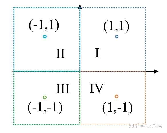 如下图,我们已知四个数据点(1,1)(-1,1)(-1,-1)(1,-1),这四个点分别对应I~IV象限,如果这时候给我们一个新的坐标点(比如(2,2)),那么它应该属于哪个象限呢?(没错,当然是第I象限,但我们的任务是要让机器知道)