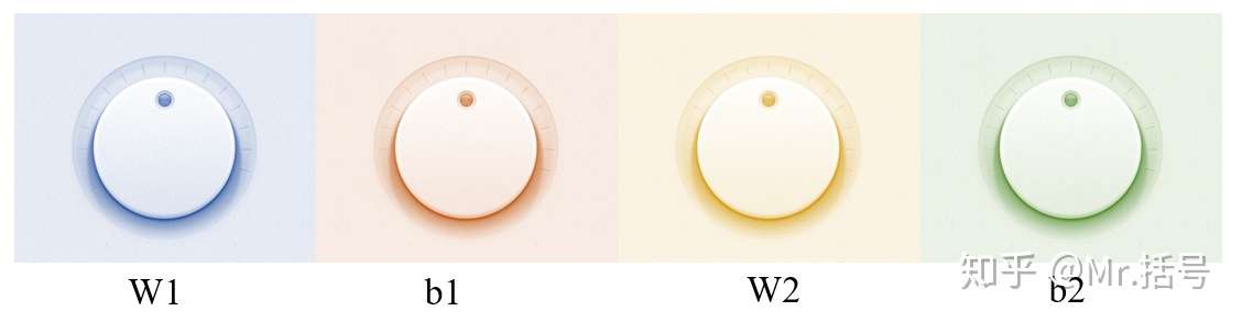我们在机器中操纵着四个旋钮,分别叫做W1,b1,W2,b2。当我们旋转其中的某个旋钮时,球形机器会发生移动,但是旋转旋钮大小和机器运动方向之间的对应关系是不知道的。而我们的目的就是走到沙漠的最低点。