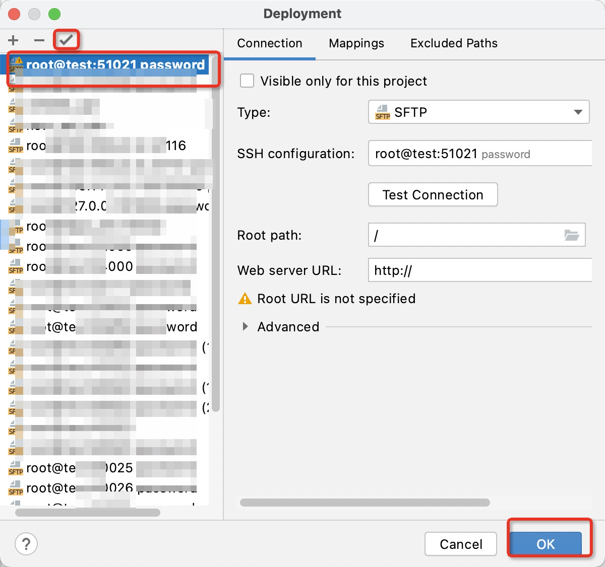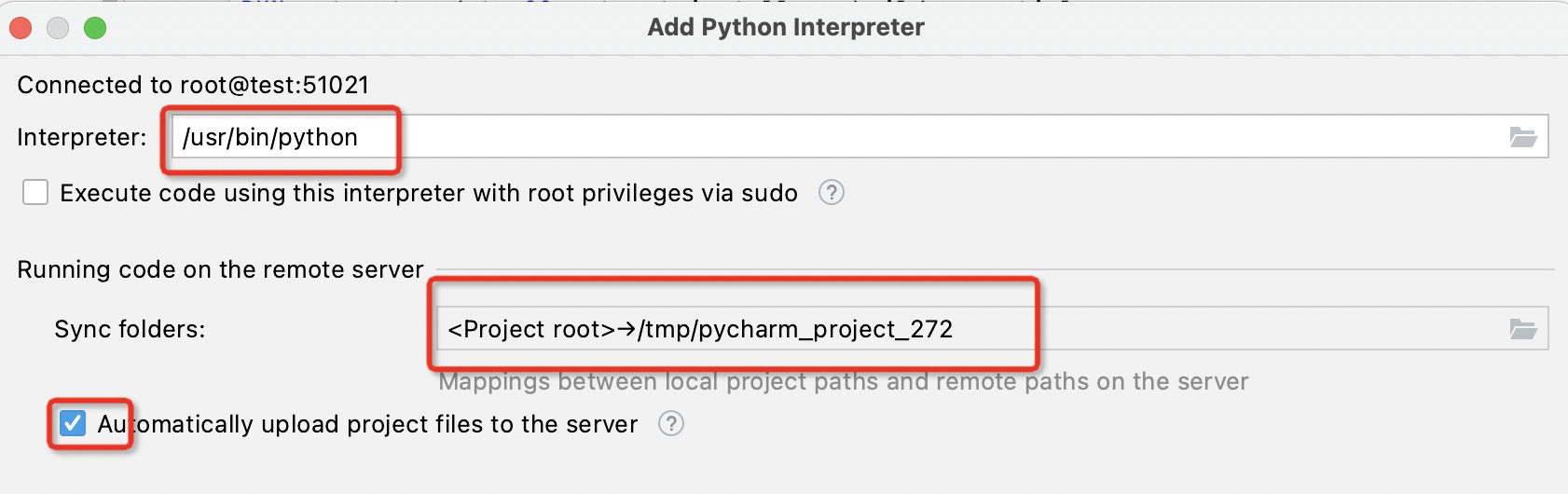 登陆成功后设置解释器路径及文件映射(左边本地路径, 右边服务器容器路径),自动上传不建议勾选, 设置完成后点击finish.