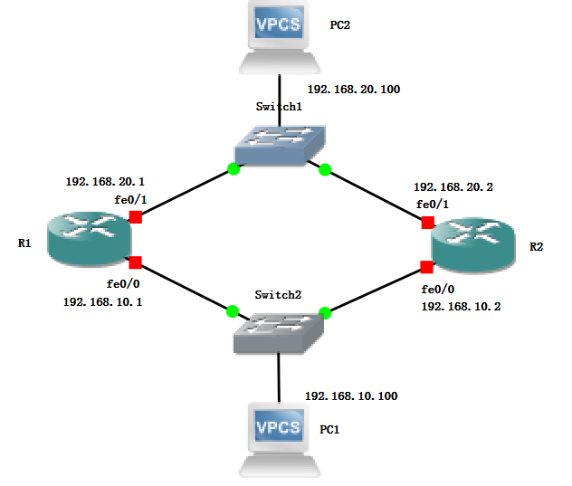 R1的fe0/1和R2的fe0/1接口组成另一个VRRP备份组,id为20。