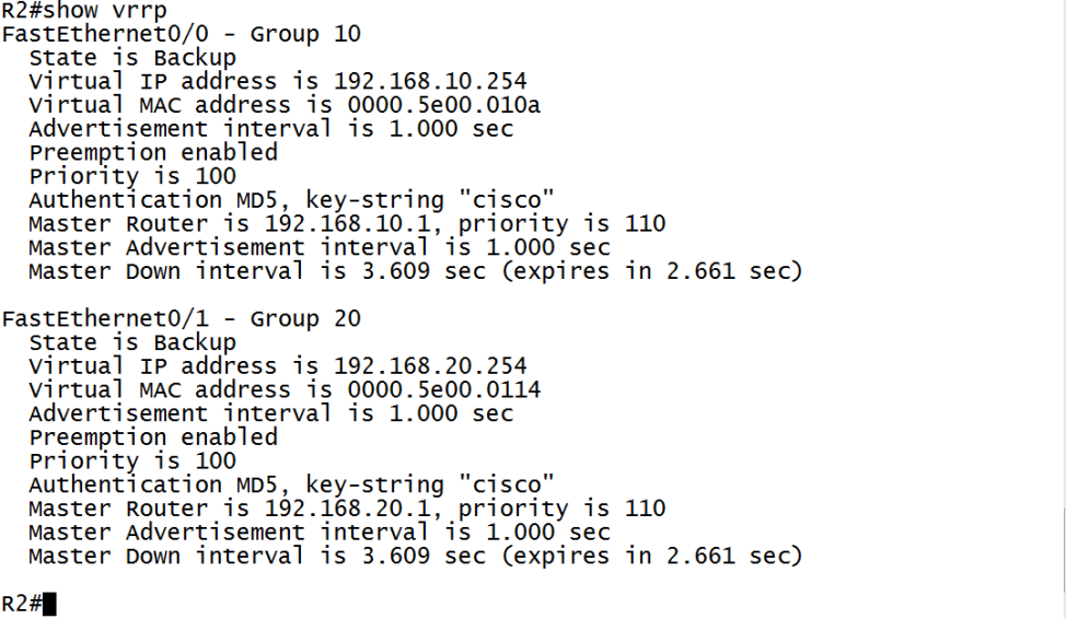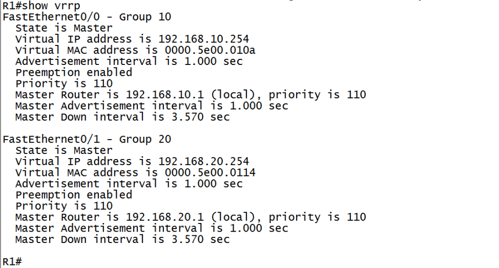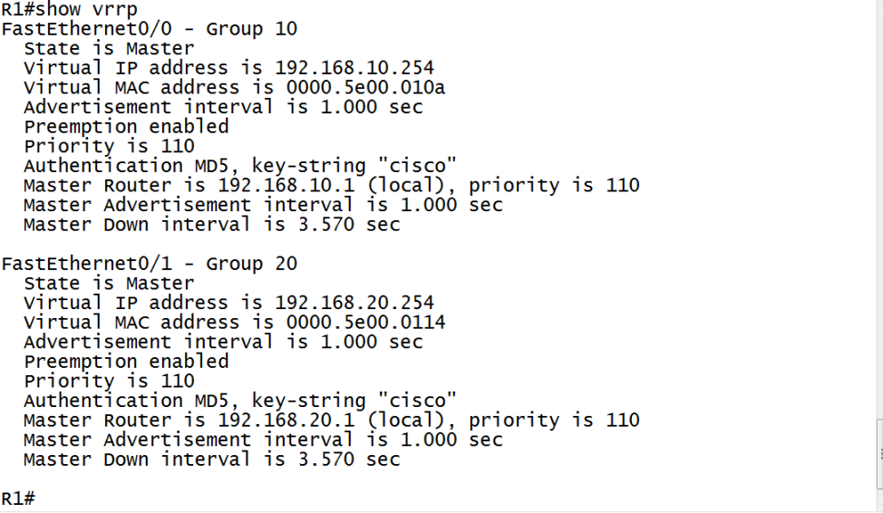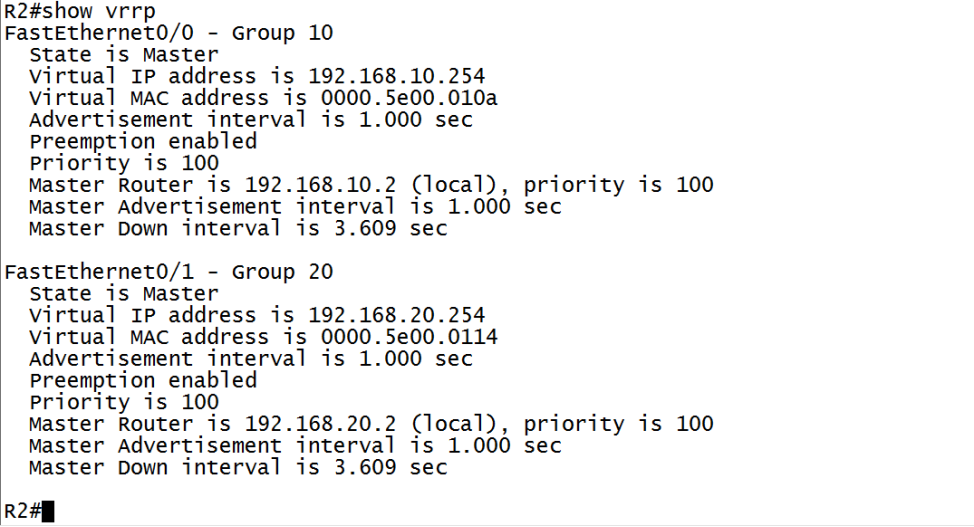 从两个设备的输出中可以看到,由于R1的f0/0和f0/1接口VRRP的优先级都设置为110,而R2的两个接口的VRRP使用默认优先级(100),因此R1在两个VRRP组中都是master。