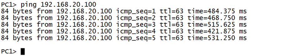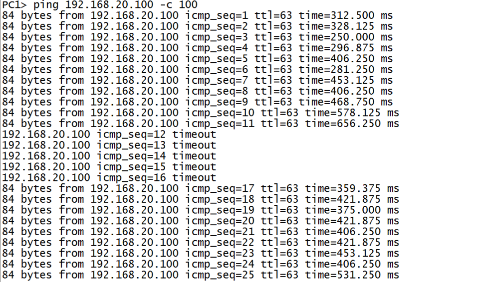 可以看到,由于VRRP协议实现了链路冗余,PC1和PC2之间的网络链路只断开了很短的时间。