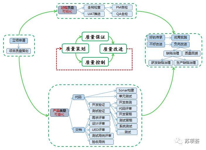 针对过程和产品采用不同的检测手段,并达到过程质量可视化,产品质量可量化的效果,问题驱动的负向改进牵引质量步步提升,改进反哺到策划里,作为新的输入材料,形成完整的PDCA闭环。