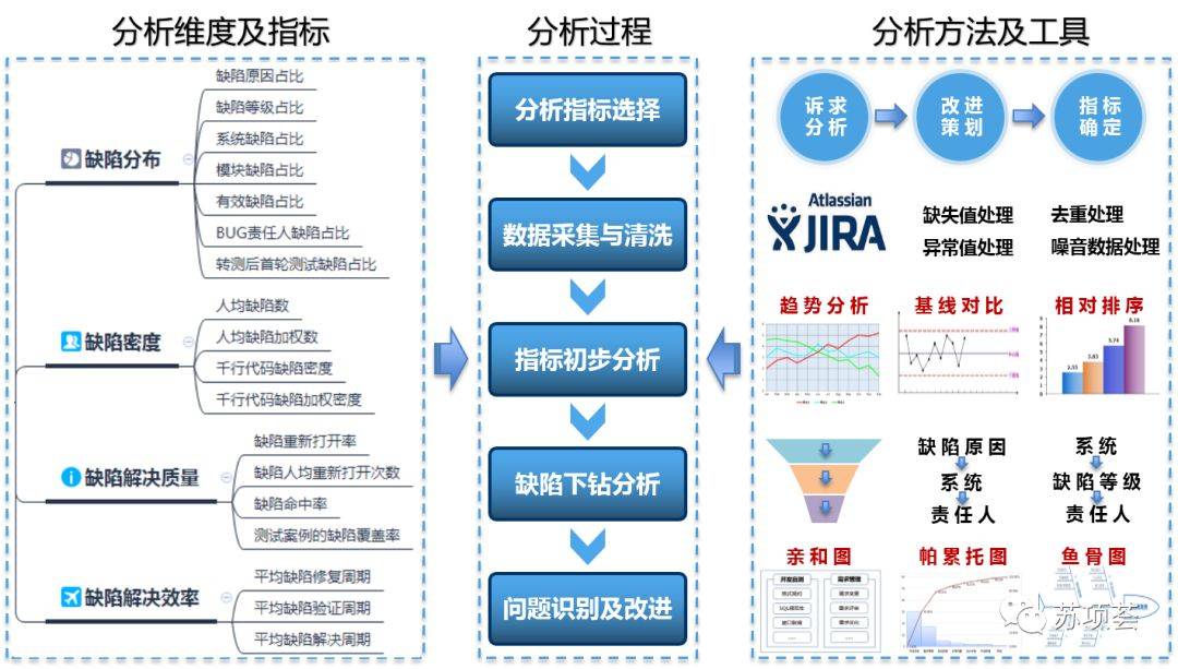 分析过程:缺陷分析是一个闭环改进的过程,其主要包括五大步骤:分析指标选择、数据采集与清洗、指标初步分析、缺陷下钻分析、问题识别与改进。