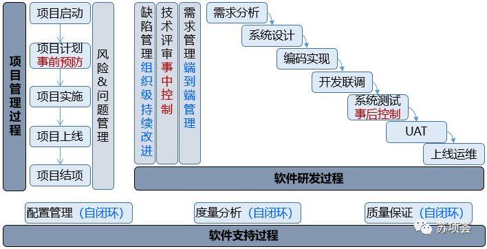 项目管理过程与软件研发过程是交互的,各自测重不同的部分,共同为项目成功交付保驾护航。针对重大项目交付,从事前预防和规划、事中监控和指导、事后总结和改进这三个方面全方位看护项目。