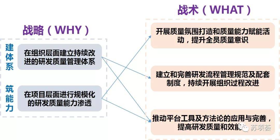 孙子曰:兵者,国之大事,死生之地,存亡之道,不可不察也。斗胆套用到质量管理上:质量者,公司之大事,兴衰之鉴,存亡之道,不可不重视也。作为一个组织的质量负责人,其核心职责就是要制定与组织战略相匹配的质量战略。战略是回答“我们为什么要这么做”,而战术是回答“我们要做什么才能达到既定的目标”。战略指导战术,而战术是达成战略的不同路径。下图是一个中长期研发质量管理战略及其战术分解的结果。图片