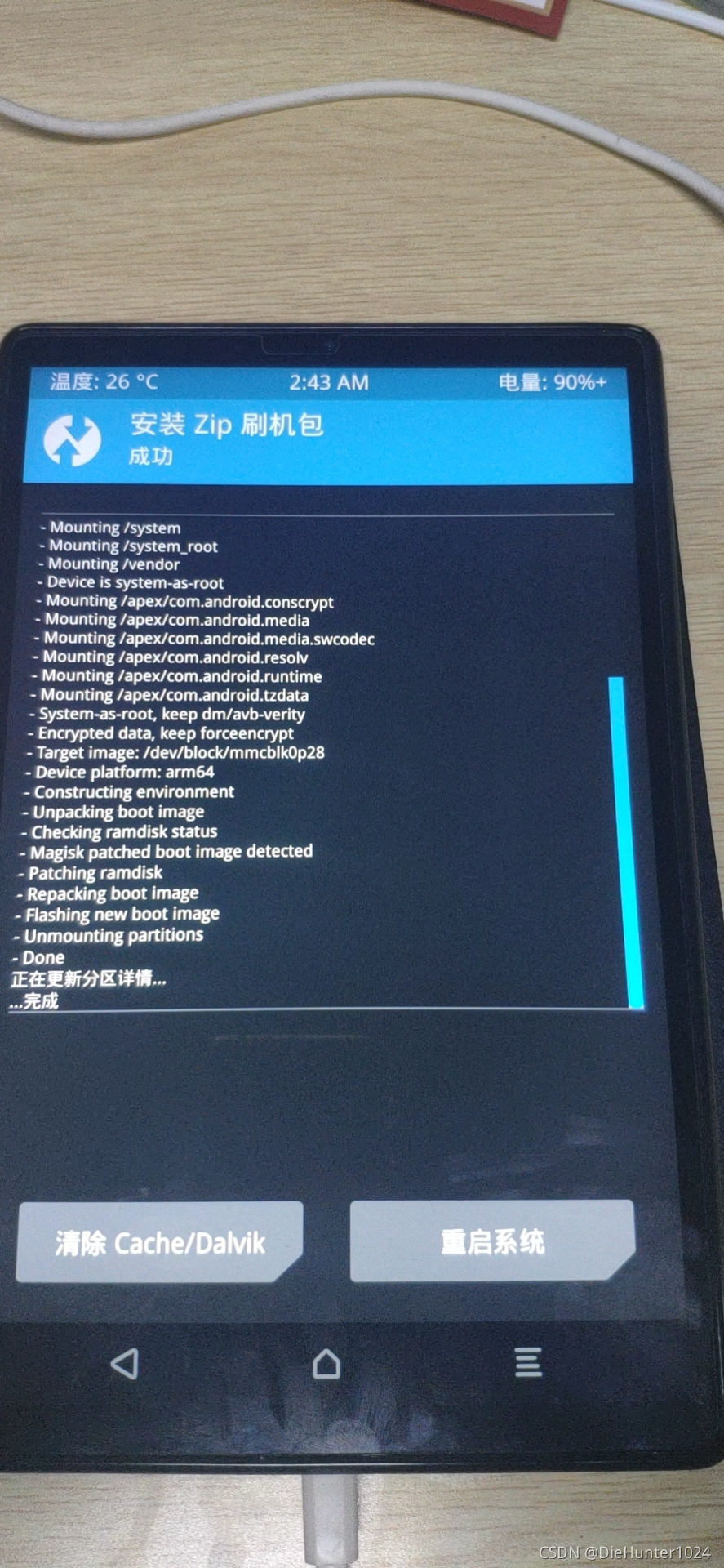 方法二:开机状态下把Magisk-v21.4.zip放在平板文件系统根目录,进入recovery,点击安装,选择Magisk.zip包,滑动刷入,最后安装完成,重启系统,就搞定了