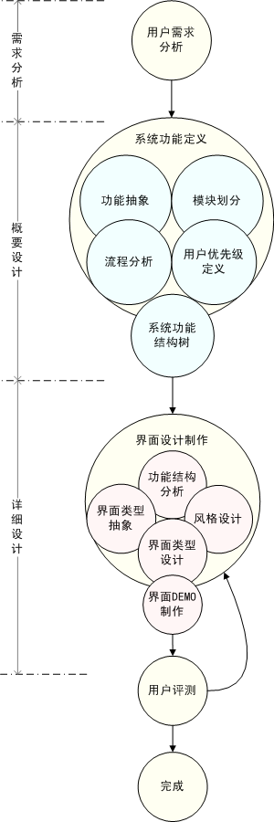 在概要设计过程中,界面设计人员需要浏览需求分析报告,了解用户的工作流程,和整个系统功能,再根据这些原始需求功能,归纳整理分析,并针对用户交互设计需要,提出意见,参与系统设计。 其中包括对原始功能的分类归纳,提出系统交互需要的新功能,对用户功能实现的优先级进行定义等等。 例如,提出用户自定义快捷面板功能,常用*作自动记录功能等,需要在概要设计时尽早提出,以方便作好系统规划。 另外,需要对整个系统中的常见功能有比较清晰的了解,归纳整个系统界面交互中常见的交互形式,例如在本系统中就包括列表、查询、搜索、填写表单、项目分解、项目选择、审批、报告等等;只有清晰的了解整个系统需求,才能较好的把握整个界面设计的统一性。当然,这也和界面设计人员的经验有很大关系。 4.主界面设计 设计主界面,确定系统基本风格,是概要设计中的工作之一。首页主界面的主要实现功能是导航,它要达到的目的,是尽可能使用户仅通过首页面板就可以完成所有常规任务。