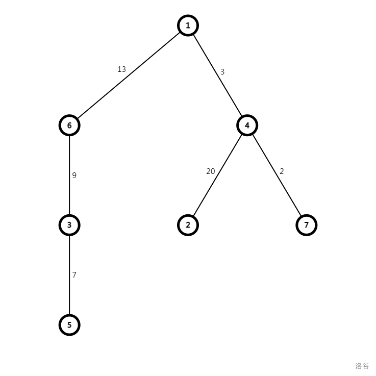 对于一个节点 \(u\),设 \(\text{Dist}(u)\) 为 \(u\) 到根节点的路径长度,\(\text{From}(u)\) 为 \(u\) 所在的子树的根节点编号。例如:
