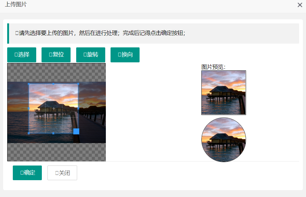 @{ //Layout = "~/areas/usmain/Views/Shared/_LayoutEdit.cshtml"; ViewBag.Title = "图片上传"; } <style> /*左侧裁剪div*/ .tailoring-box-parcel { width: 250px; height: 250px; float: left; border: black 1px solid; margin-top: 2px; } /*右侧预览div*/ .preview-box-parcel { width: 250px; height: 250px; float: right; margin-top: 2px; } /*//方形预览框*/ .square { width: 110px; height: 110px; border: black 1px solid; } /*//圆形预览框*/ .circular { width: 110px; height: 110px; border: black 1px solid; border-radius: 50%; margin-top: 7px; } .preview{ overflow:hidden;/*预览div多余部分隐藏*/ } </style> <div class="layui-layout-body"> <!--图片裁剪框 start--> <div class="tailoring-container1"> <div class="black-cloth" onclick="closeTailor(this)"></div> <div class="tailoring-content"> @*<div class="tailoring-content-one"> 上传图片 <div class="close-tailoring" onclick="closeTailor(this)">×</div> </div>*@ <div class="layui-elem-quote usquotemar"> <i class="us-icon usiconmar"></i>请先选择要上传的图片,然后在进行处理;完成后记得点击确定按钮; </div> <div class="tailoring-content-three"> <button class="layui-btn cropper-reset-btn" id="btnchooseImg"><i class="us-icon"></i>选择</button> <button class="layui-btn cropper-reset-btn usbtnblack"><i class="us-icon"></i>复位</button> <button class="layui-btn cropper-rotate-btn usbtnblue"><i class="us-icon"></i>旋转</button> <button class="layui-btn cropper-scaleX-btn usbtnblack"><i class="us-icon"></i>换向</button> </div> <div class="tailoring-content-two"> @*左侧裁剪*@ <div class="tailoring-box-parcel"> <img id="tailoringImg"> </div> @*右侧预览 圆形 方形*@ <div class="preview-box-parcel"> <p>图片预览:</p> <div class="square preview"></div> <div class="circular preview"></div> </div> </div> </div> </div> @* <div hidden="hidden"><input type="file" accept="image/jpg,image/jpeg,image/png" name="file" id="chooseImg" class="hidden" onchange="selectImg(this)"></div>*@ <div hidden="hidden"><input type="file" accept="image/jpg,image/jpeg,image/png" name="file" id="chooseImg" class="hidden"></div> <!--图片裁剪框 end--> <hr /> <div class="layui-fluid"> <div class="layui-form-item"> <div class="uscenter"> <button class="layui-btn " id="sureCut"><i class="us-icon"></i>确定</button> <button type="button" class="layui-btn layui-btn-primary" data-pwid="usclose"><i class="us-icon"></i>关闭</button> </div> </div> </div> </div> <script type="text/javascript"> var usw = 1, ush = 1; var usoss = "0"; //获取裁剪框图片 --初始化裁剪框固定且不可放大缩小 var image = document.querySelector('#tailoringImg'); </script> <script src="~/assets5/js/LoadImg.js"></script>
