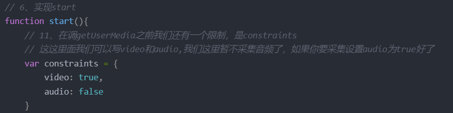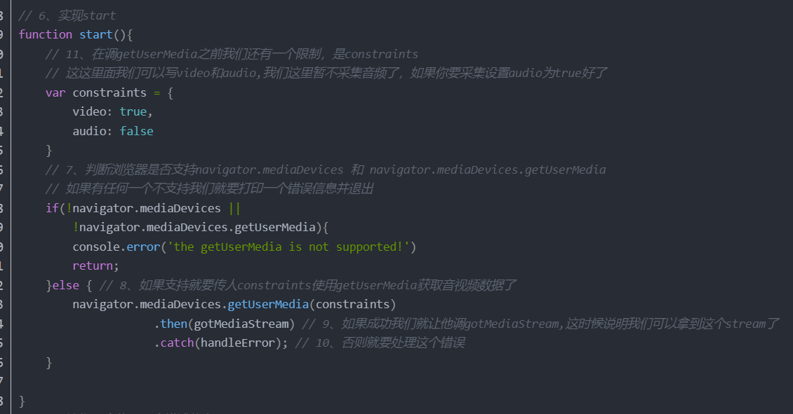 function start(){ // 11、在调getUserMedia之前我们还有一个限制,是constraints // 这这里面我们可以写video和audio,我们这里暂不采集音频了,如果你要采集设置audio为true好了 var constraints = { video: true, audio: false } // 7、判断浏览器是否支持navigator.mediaDevices 和 navigator.mediaDevices.getUserMedia // 如果有任何一个不支持我们就要打印一个错误信息并退出 if(!navigator.mediaDevices || !navigator.mediaDevices.getUserMedia){ console.error('the getUserMedia is not supported!') return; }else { // 8、如果支持就要传人constraints使用getUserMedia获取音视频数据了 navigator.mediaDevices.getUserMedia(constraints) .then(gotMediaStream) // 9、如果成功我们就让他调gotMediaStream,这时候说明我们可以拿到这个stream了 .catch(handleError); // 10、否则就要处理这个错误 } }