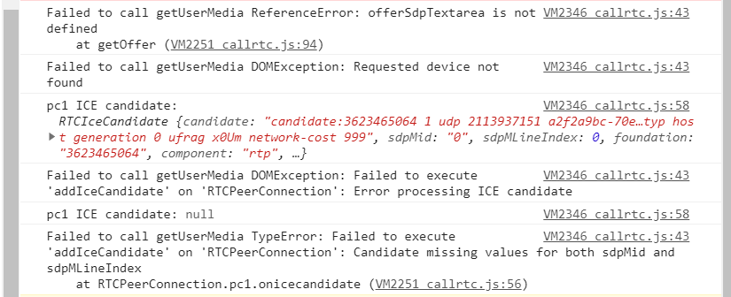 pc2.onicecandidate = (e)=> { // send candidate to peer // receive candidate from peer /** * 31、所以它就调用pc1.addIceCandidate,这是当他们收集到candidate之后要做的事情 */ pc1.addIceCandidate(e.candidate) .catch(handleError); console.log('pc2 ICE candidate:', e.candidate); }