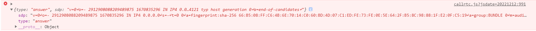 sdp: "v=0 ↵o=- 2912908088209489875 1670835296 IN IP4 0.0.0.0 ↵s=- ↵t=0 0 ↵a=fingerprint:sha-256 66:B5:08:FF:C6:4B:6E:70:14:C0:60:BD:4D:07:C1:ED:FE:73:FE:0E:5E:64:2F:B5:8C:98:88:1F:E2:0F:C5:19 ↵a=group:BUNDLE 0 ↵m=audio 9 UDP/TLS/RTP/SAVPF 111 9 0 8 ↵c=IN IP4 0.0.0.0 ↵a=setup:active ↵a=mid:0 ↵a=ice-ufrag:wCtkysHeNdAVBMyT ↵a=ice-pwd:NXUReimhxfbhZyFMJZyKrNTOWFPstvDJ ↵a=rtcp-mux ↵a=rtcp-rsize ↵a=rtpmap:111 opus/48000/2 ↵a=fmtp:111 minptime=10;useinbandfec=1 ↵a=rtpmap:9 G722/8000 ↵a=rtpmap:0 PCMU/8000 ↵a=rtpmap:8 PCMA/8000 ↵a=recvonly ↵a=candidate:foundation 1 udp 2130706431 192.168.2.89 34121 typ host generation 0 ↵a=candidate:foundation 2 udp 2130706431 192.168.2.89 34121 typ host generation 0 ↵a=end-of-candidates ↵"