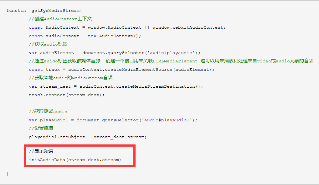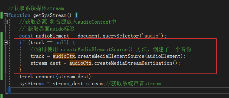 //获取系统媒体stream function getSysStream() { //获取音源 将音源放入audioContext中 // 获取界面auido标签 const audioElement = document.querySelector('audio'); if (track == null) { //通过使用 createMediaElementSource() 方法,创建了一个音源 track = audioCtx.createMediaElementSource(audioElement); stream_dest = audioCtx.createMediaStreamDestination(); } track.connect(stream_dest); sysStream = stream_dest.stream;//获取系统声音stream }