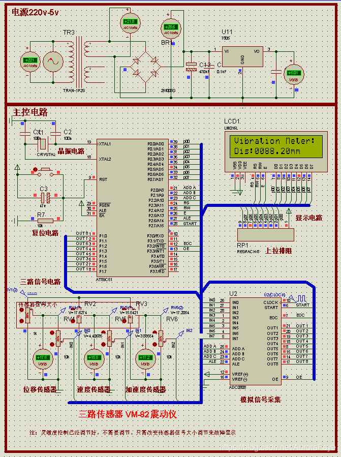 模拟了三路传感器,位移传感器、速度传感器、加速度传感器,三个传感器的值实时显示在液晶屏幕上。包含电源电路,单片机最小系统,三路传感器电路,显示器电路,AD采集电路。